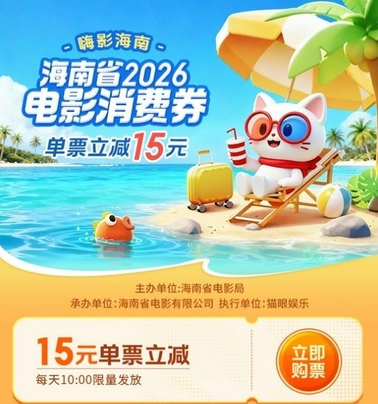 此次惠民活动采用单票立减的形式,每日向海南用户发放观影福利。活动期间,用户可通过猫眼App、微信服务号、美团App、大众点评App等平台参与活动。每天10时,平台将限量开启补贴通道,市民可通过抢券的形式,享受“单票立减15元”的优惠。
