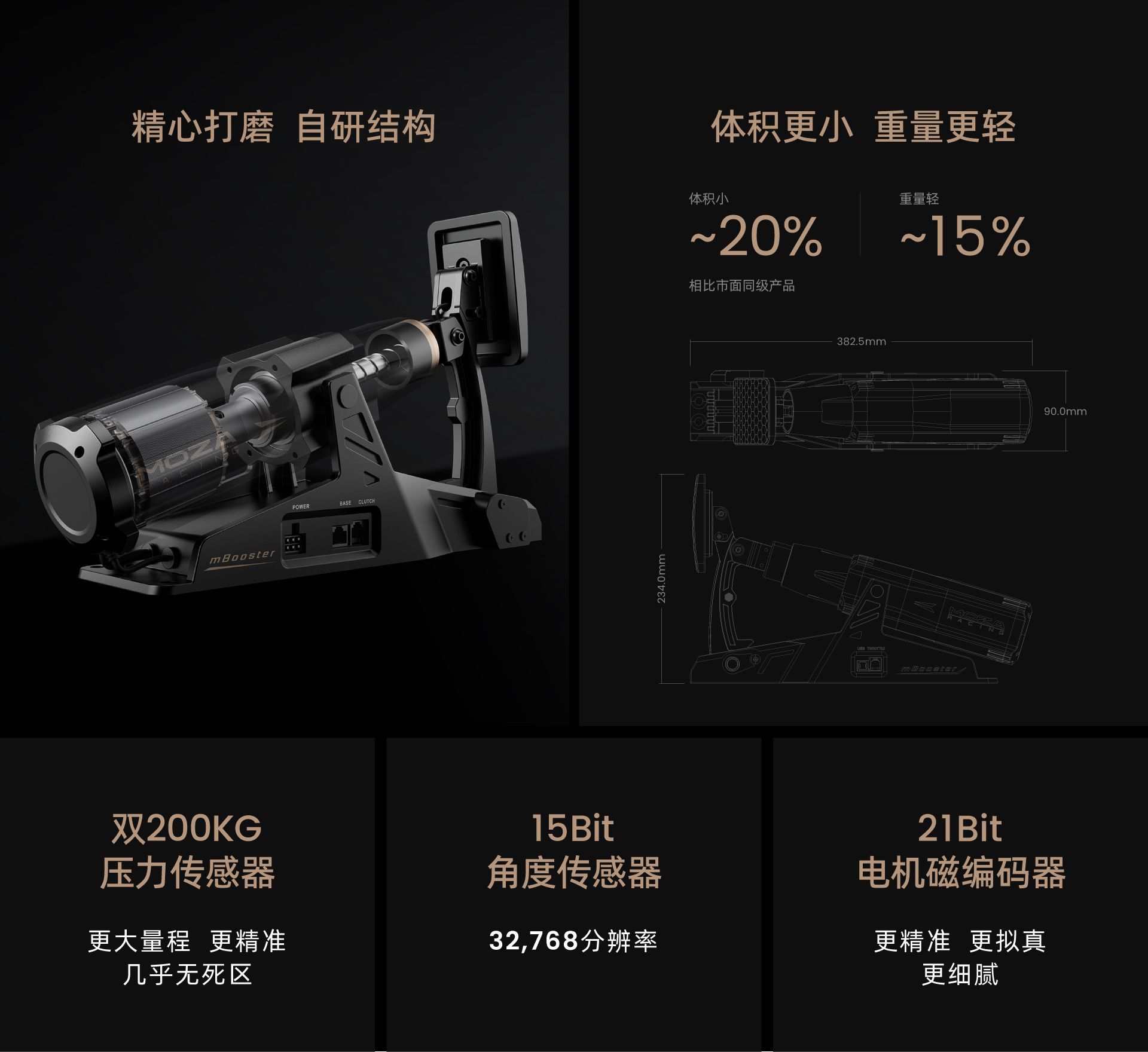 吴彦祖、李治廷、高华阳拥有的MOZA mBooster主动踏板是MOZA历经四年时间投入打磨、联合多家全球知名汽车品牌厂队、F1模拟器车手和TCR冠军车手共同研发、联调优化的赛道“大杀器”。mBooster以MOZA数字底盘技术的线控刹车系统为核心,可通过高扭矩密度伺服电机电控系统模拟不同的脚感并提供真实反馈,支持通过MOZA自研软件Pit House一键设置任意脚感,搭载双200KG压力传感器、15Bit角度传感器、21Bit电机磁编码器,结合自研的压力与角度传感器融合算法,让响应更快、控制更精准。此外mBooster还具备体积小、轻量化的结构优势,相较市面上的同级产品,mBooster体积小了20%,重量轻了15%。