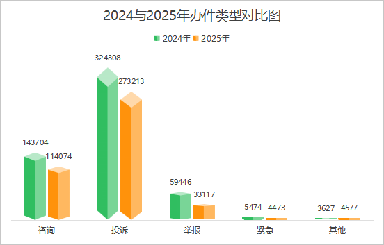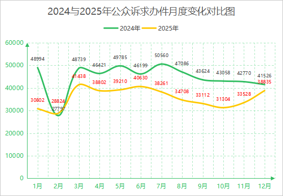 数据统计显示,2025年海口市市场监管部门接收的投诉举报量呈现“月度总体下降、仅2月小幅增长”的态势。除2月同比增长3.7%外,其余11个月投诉举报量均显著低于2024年同期,降幅区间为6%至37%。其中,1月降幅最为明显,达37%;2月办件量为全年最低,仅28824件。