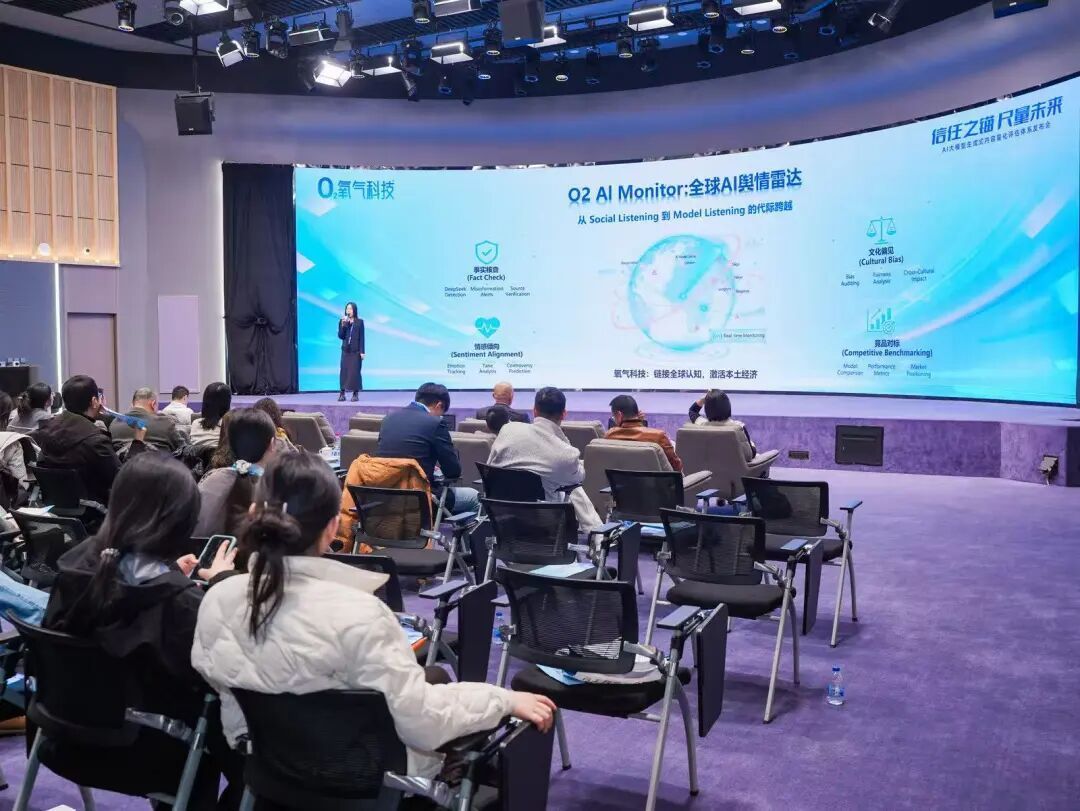 正是在这一关键节点,氧气科技精准切中时代脉搏。在众多行业领袖的见证下,氧气科技联合创始人、首席运营官向昱筱发表主题演讲,深刻阐述了从“社媒聆听”向“大模型聆听”跨越的技术变革。她指出,当前全球大模型与国内大模型对中国城市及品牌的认知存在显著的“认知剪刀差”——海外模型往往存在滞后与片面,而国内模型则面临信息过载的挑战。