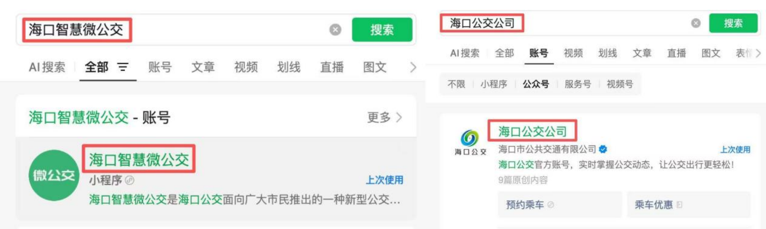 1.线上预约(推荐):微信搜索“海口智慧微公交”小程序或“海口公交公司”公众号,选择【龙湖天街商圈片区】或【美兰机场及灵山镇接驳片区】,进行预约购票。