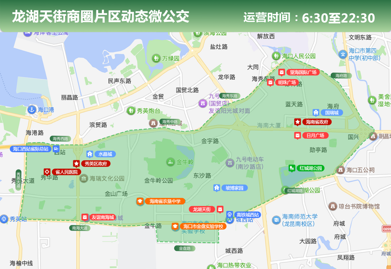 运营边界:主要覆盖秀英大道、海秀西路、海秀中路、海秀东路、海府路、红城湖路、金盘路、南海大道围合区域。