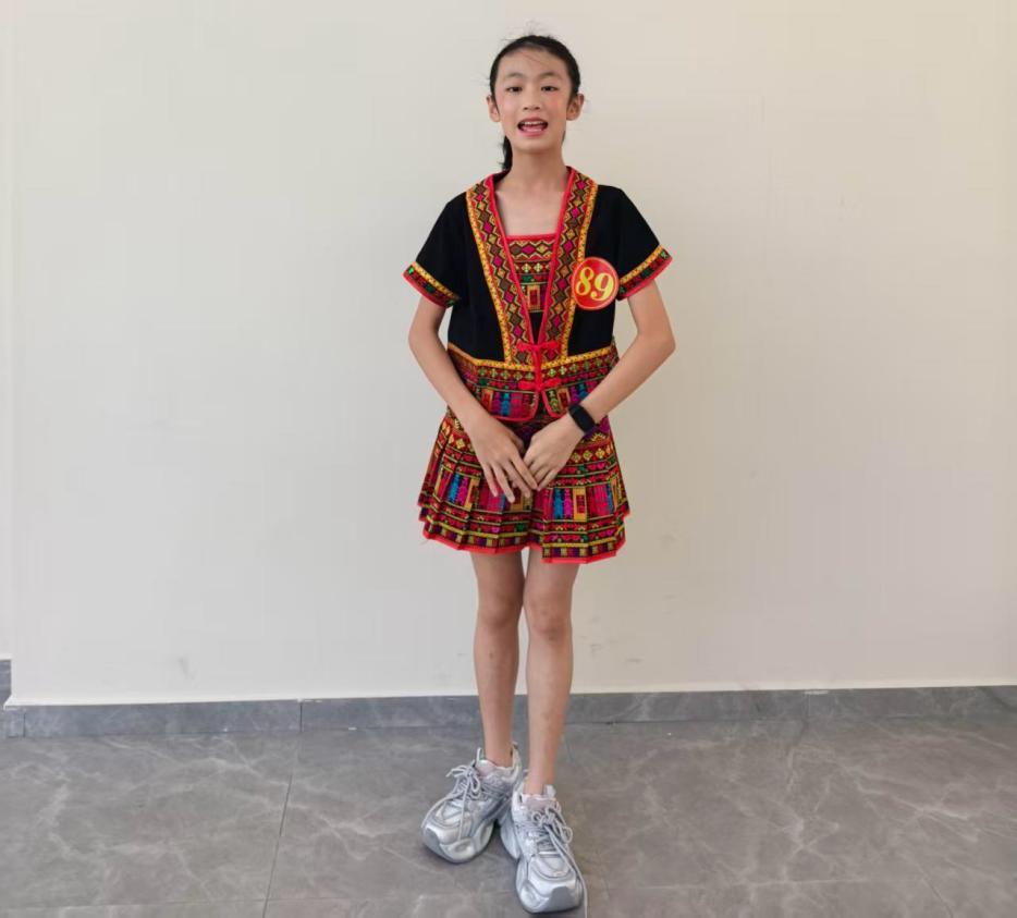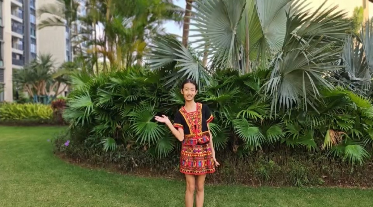 后来,我录制了一个全英文的黎族打柴舞推荐视频,收到了很多老师朋友的点赞。我还经常在学校、社区用英语向外国游客和朋友们介绍打柴舞,大家都叫我“小小国际传播员”。每次看到他们眼中闪烁的好奇与喜爱,我就特别自豪——原来我也可以成为文化的小使者,让黎族的竹竿声传到更远的地方。