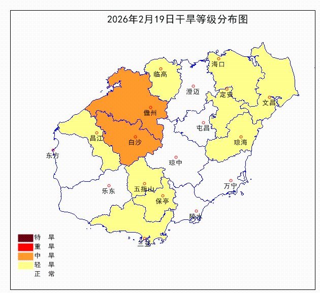气象干旱情况:截至2月19日,白沙和儋州出现中度气象干旱,昌江、临高、定安、海口、三亚、五指山、保亭、琼海和文昌出现轻度气象干旱,其余市县处于无气象干旱状态。2月11日相比,澄迈由中旱缓解为无旱,海口、定安、临高和昌江由中旱缓解为轻旱,屯昌、琼中、东方、陵水和乐东由轻旱缓解为无旱,其他市县气象干旱状态无变化。