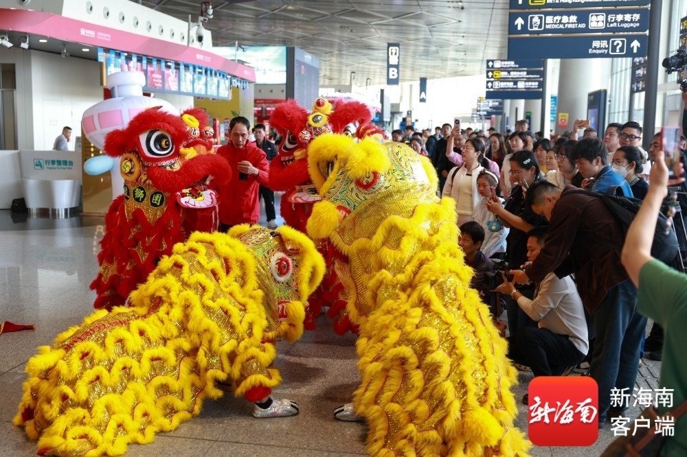 春节假期,旅客在海口美兰机场观看舞狮表演。海南机场供图