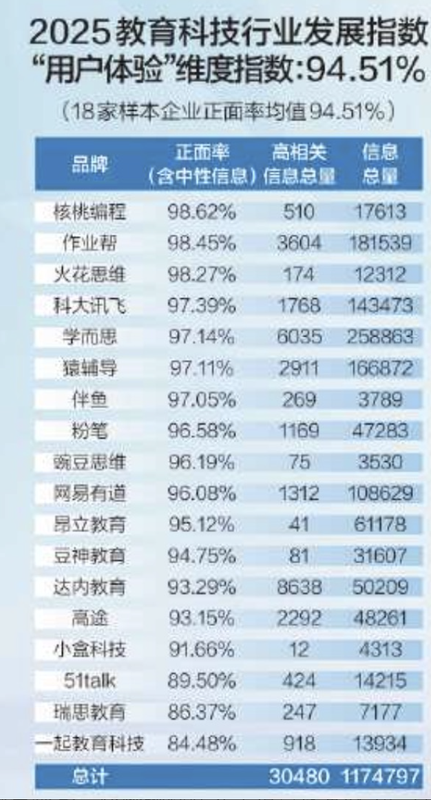 用户体验优秀:核桃编程获得2025 教育科技行业发展指数-「用户体验」维度教育行业排名第一