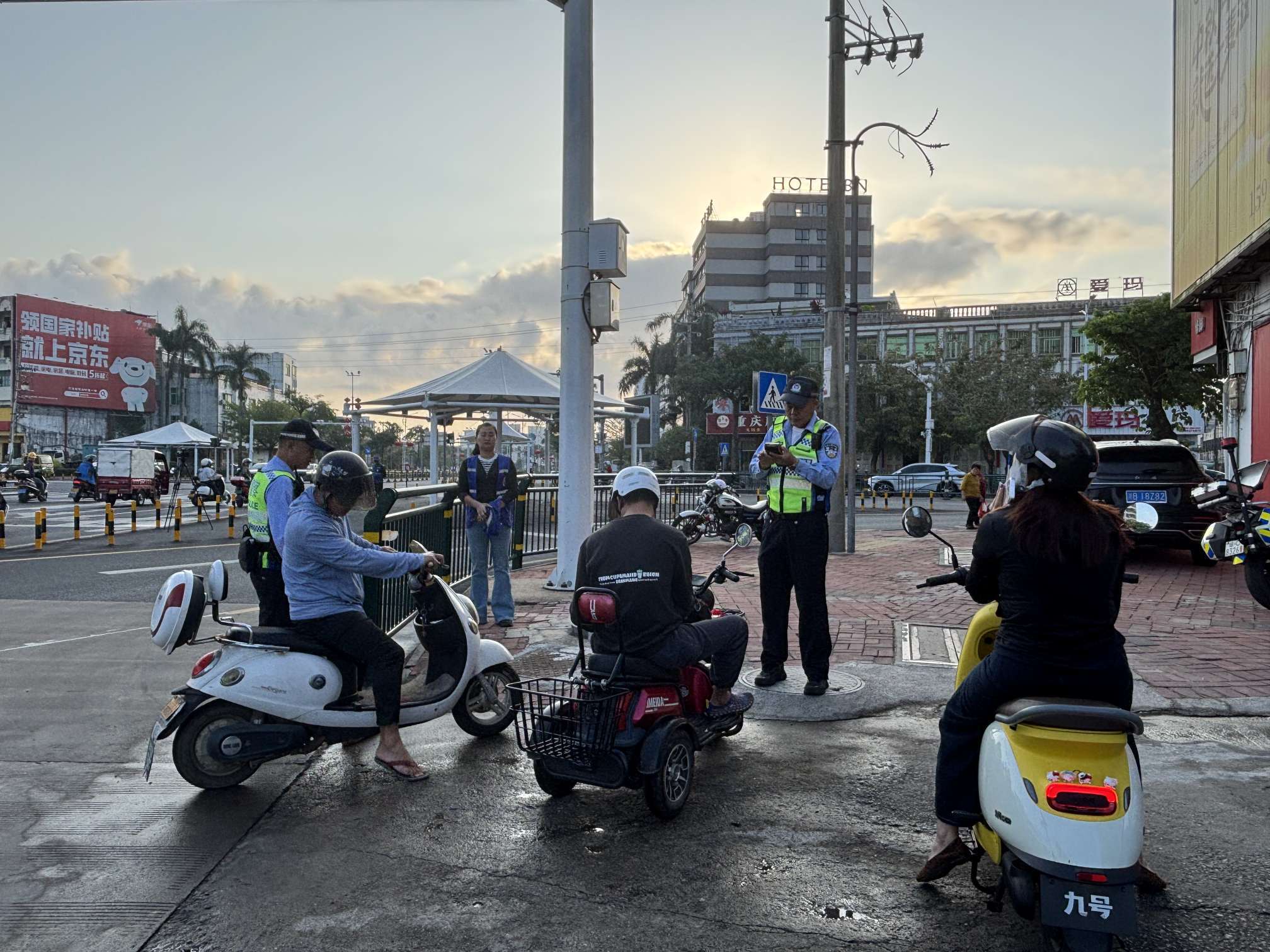 上午7时许,万宁环市西路与文明中路交叉口车流如织。几名志愿者配合执勤民警对闯红灯、不佩戴安全头盔、越线停车等行为进行耐心劝导。“您好,现在是红灯,请在等待区稍候。”“为了安全,请退到停车线后。”执勤民警和志愿者对发现的交通违法行为及时纠正,对当事人进行现场交通安全教育。
