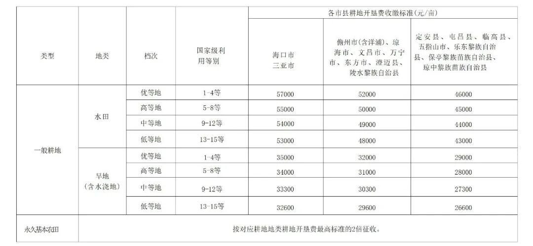 附件1.海南省耕地开垦费收缴标准表