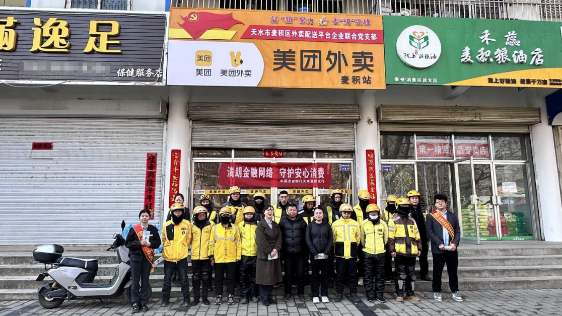 3月13日,在“3·15”国际消费者权益日来临之际,农行麦积支行将金融课堂搬进了美团外卖站点,开展了一场以“清朗金融网络 守护安心消费”为主题的暖心活动,为平日里穿梭于大街小巷的“骑士”们送去了一份特殊的“金融安全餐”。