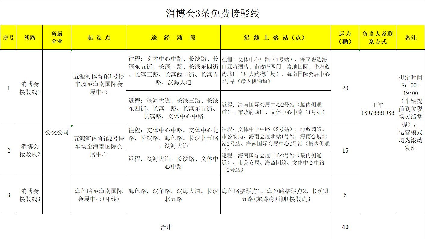 同时,为更好为市民、客商营造高效便捷的公交出行环境,10条新开公交专线(7条消博会公交专线、3条消博会免费接驳线)13日的运营保障时间为13:00至19:00,14日至18日的运营保障时间为07:30至19:00,车辆信息将同步接入“海口交投集团”微信公众号实时公交查询系统,市民、客商可实时查询公交动态,精准规划出行线路。