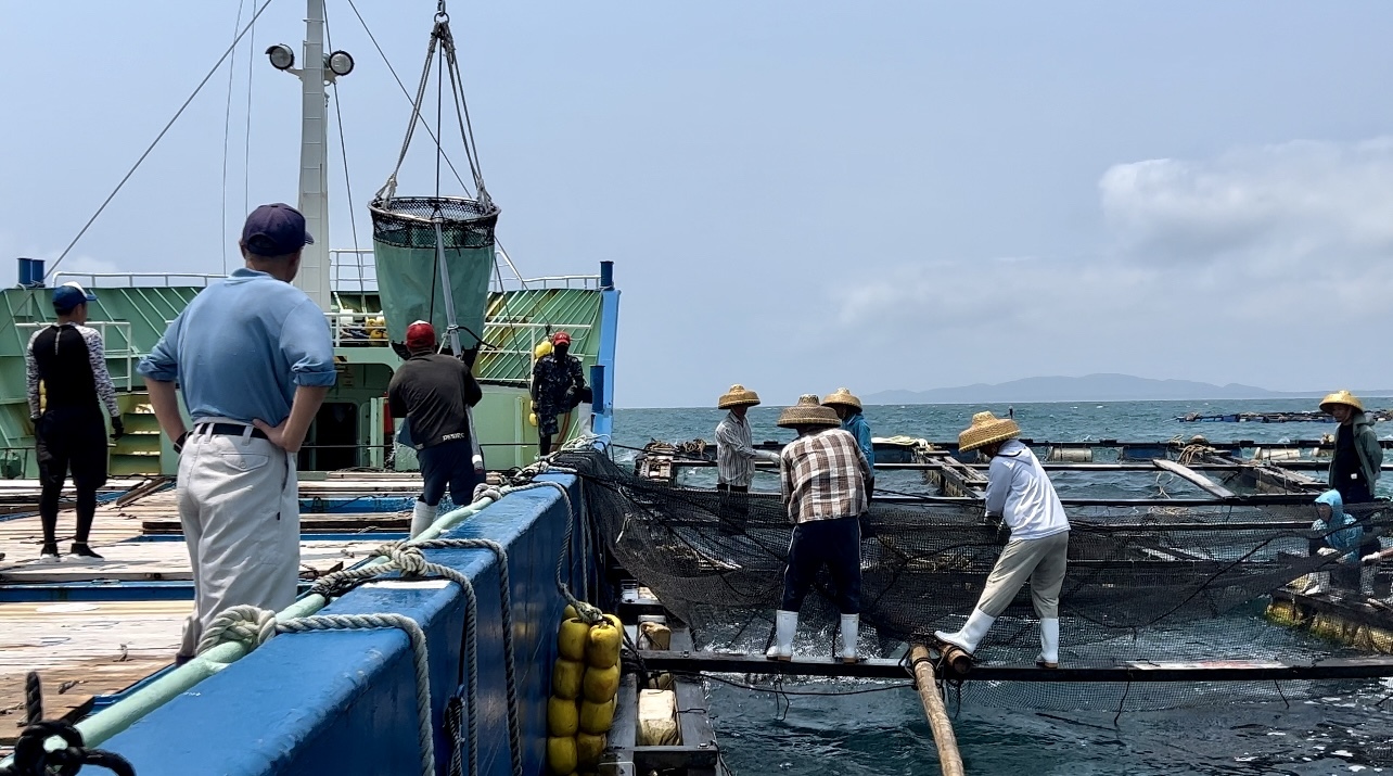 4月10日,万宁甘蔗岛海域,海上养殖渔排一片繁忙。数十名工人围成一圈,齐心协力拉起渔网,将一尾尾章雄鱼苗(学名鰤鱼)打捞出水。这批共13.4万尾、货值420万元人民币的鱼苗被转运至日籍鱼苗船“第二十一住宝丸”,投入蓄鱼仓,启程驶往日本。