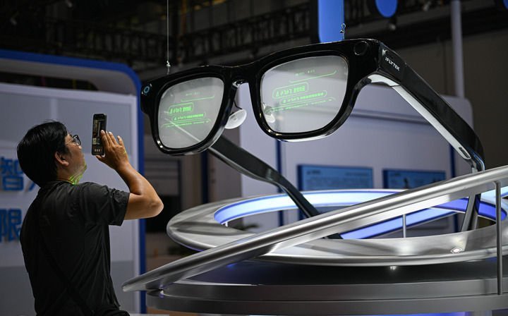 4月10日在第六届消博会主会场拍摄的AI眼镜模型。新华社记者蒲晓旭 摄