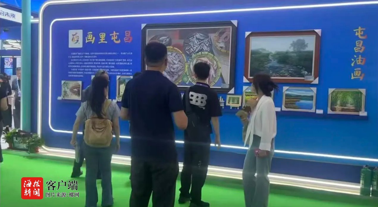 展会现场,海南馆内屯昌展区人气高涨、亮点频现。屯昌县油画产业协会带来的12幅精品油画,以海南热带风光、黎苗民俗文化、乡村振兴风貌为创作主题,笔触细腻、意境鲜活,充分彰显“中国油画之乡”深厚艺术底蕴。展区内的特色农产品、精致水晶等好物同步亮相,吸引众多客商与观众驻足品鉴、拍照打卡。