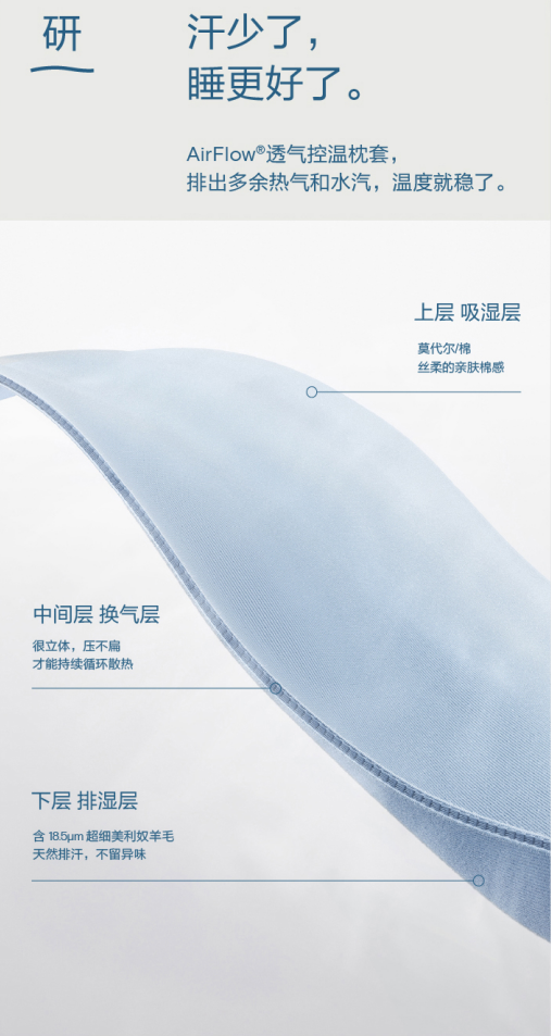 吸湿层采用亲肤混纺材质,触感柔和;换气层保持空气持续流通,加快热量散发;排湿层嵌入 18.5 微米美利奴羊毛纤维,可吸附湿气与异味,帮助维持枕面干爽舒适。