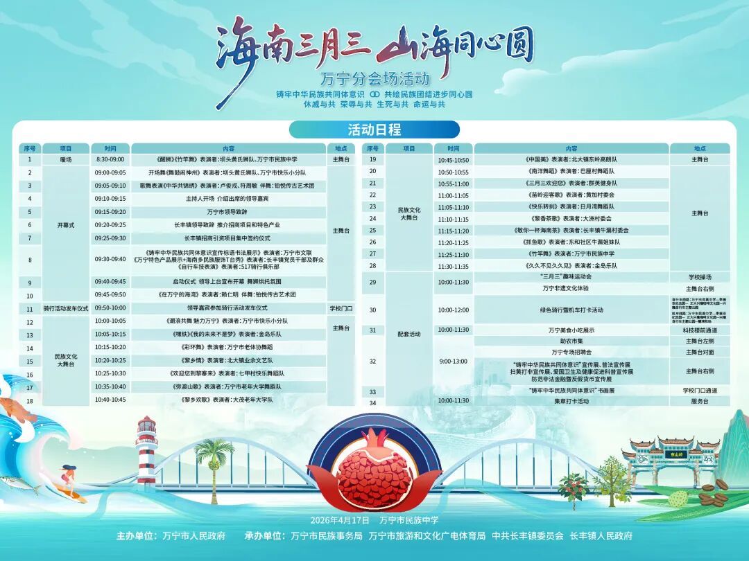 记者从4月15日召开的2026年“山海同心圆 民族一家亲”长丰专场新闻发布会上获悉,2026年海南“三月三”万宁分会场活动开幕式将于4月17日上午在万宁市民族中学举行。本次万宁分会场活动落地长丰镇,以民族文化大舞台为沉浸式“同心路”,通过系列配套活动、多维度融合互为“邻家”,共同见证民族团结进步成果转化为百姓可感可及的民生福祉。目前,活动各项筹备工作已准备就绪。